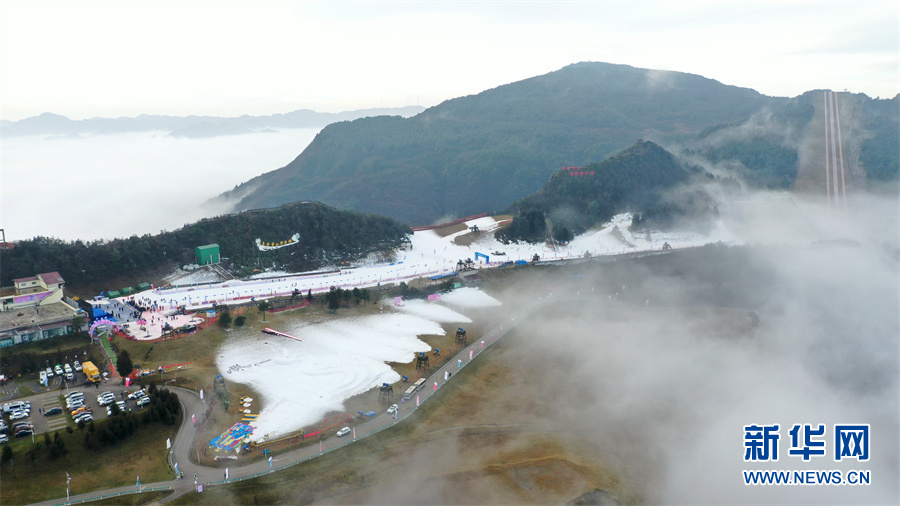圖為1月12日航拍的貴州六盤水市玉舍雪山滑雪場。