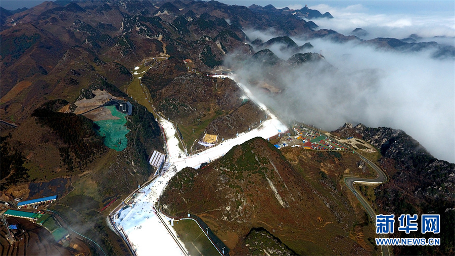 圖為航拍的貴州六盤水市梅花山國際滑雪場(2017年1月18日攝)。新華網 周遠鋼 攝