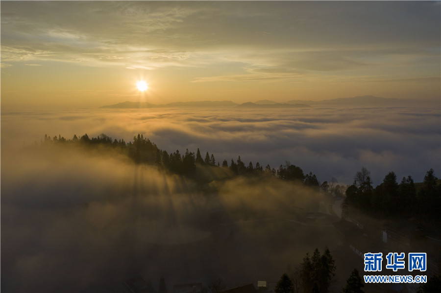1月19日,在貴州省從江縣高增鄉天鵝山拍攝的雲海景觀(無人機照片)。新華網發(吳德軍 攝)