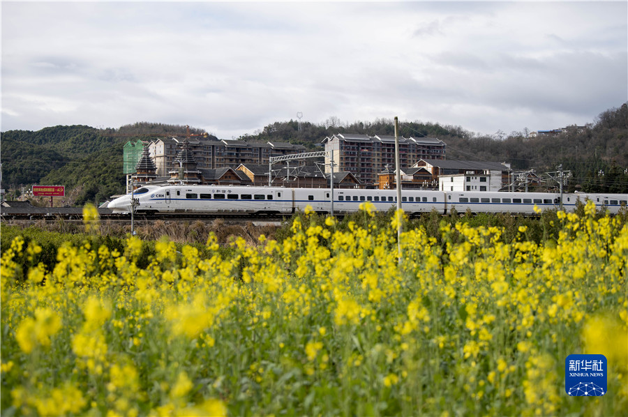 近日,貴州省黔東南苗族侗族自治州從江縣境內的油菜花陸續開放,動車組列車穿行其間,美不勝收。