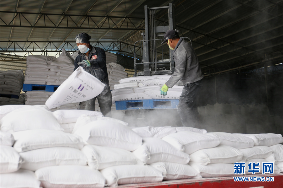 2月17日,在紫雲苗族布依族自治縣産業園區的一家新材料企業內,工人將石粉搬運裝車後運往外地。新華網 周遠鋼 攝