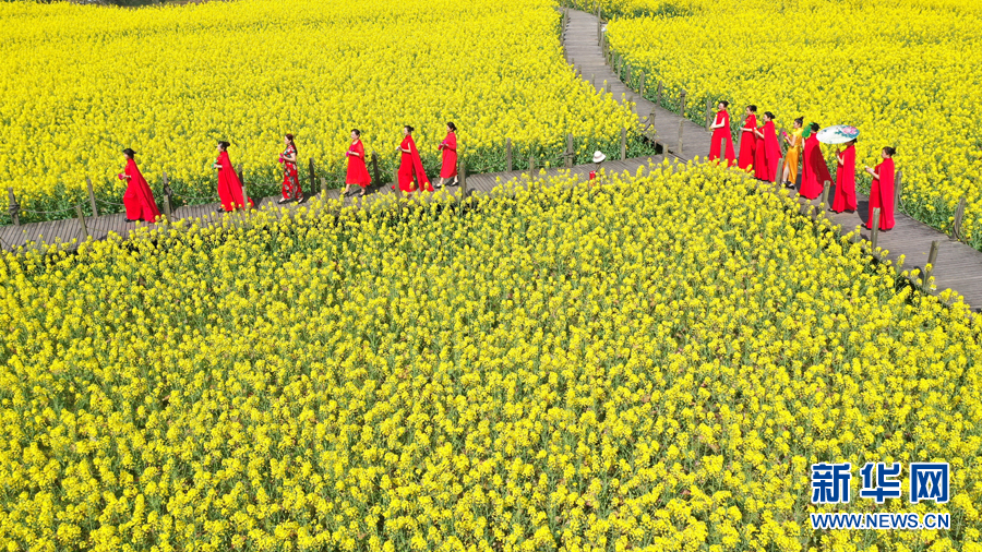 3月7日,游客在貴州平塘縣平舟鎮京舟村的油菜花田裏游玩。新華網 周遠鋼 攝