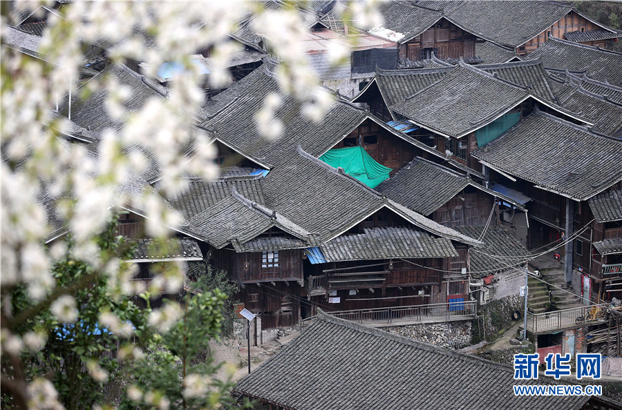 3月12日拍攝的李子花映襯下的貴州省黔東南苗族侗族自治州丹寨縣南皋鄉大簸箕苗寨。新華網發(黃曉海 攝)