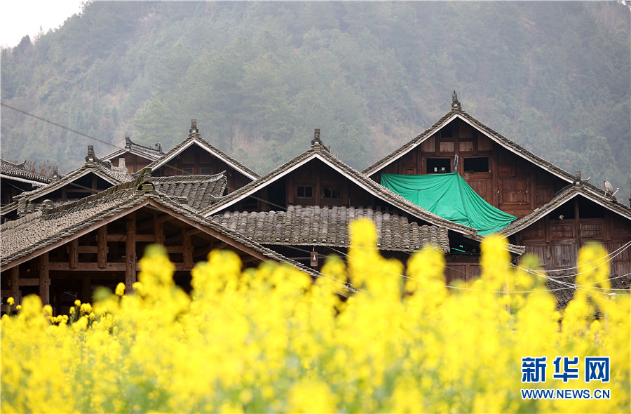 3月12日拍攝的油菜花映襯下的貴州省黔東南苗族侗族自治州丹寨縣南皋鄉大簸箕苗寨。新華網發(黃曉海 攝)