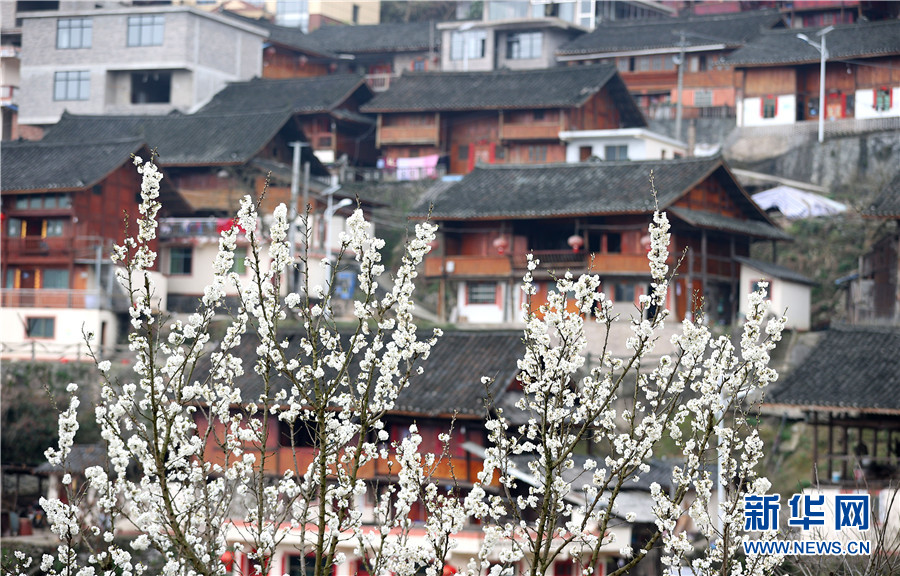 3月12日拍攝的李子花映襯下的貴州省黔東南苗族侗族自治州丹寨縣興仁鎮窯貨苗寨。新華網發(黃曉海 攝)