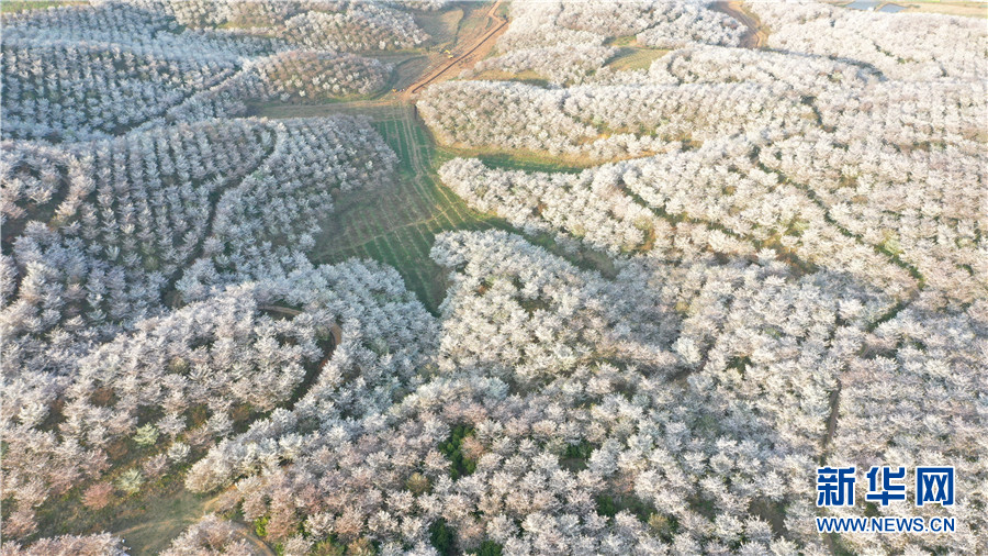 3月19日航拍的貴州安順市西秀區黃臘鄉櫻花園。