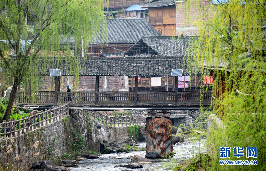 在貴州省從江縣往洞鎮增衝村,翠綠的柳枝映襯着侗寨風雨橋和民居(3月16日攝)。