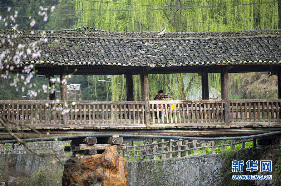 在貴州省從江縣往洞鎮增衝村,綻放的桃花與翠綠的柳枝映襯着侗寨風雨橋(3月16日攝)。新華網發(吳德軍 攝)