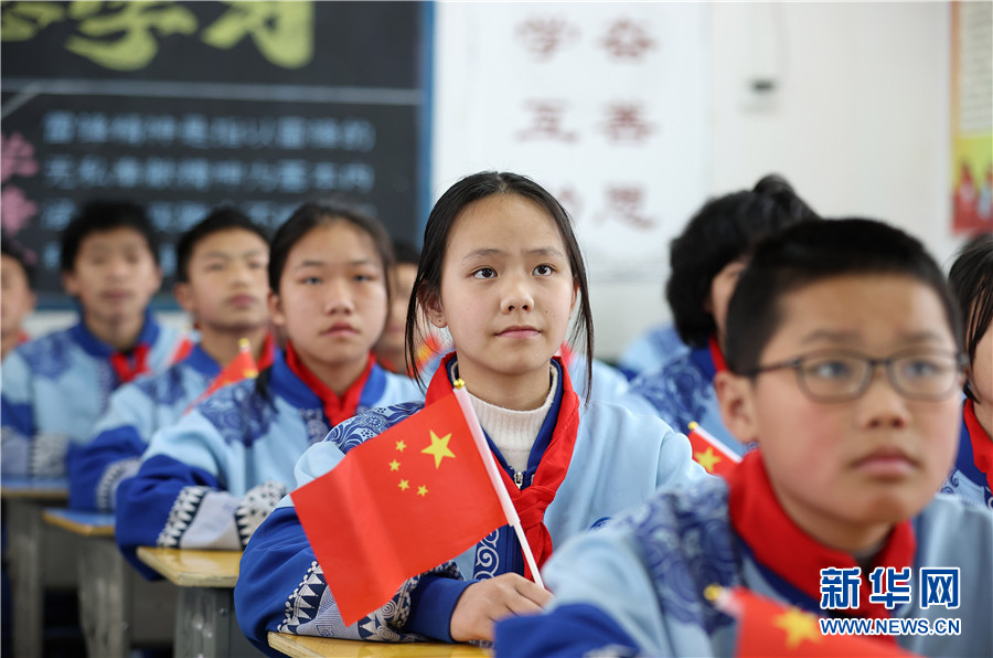 3月23日,六年級小學生在貴州省黔東南苗族侗族自治州丹寨縣揚武鎮民族小學教室裏觀看“天宮課堂”電視直播。