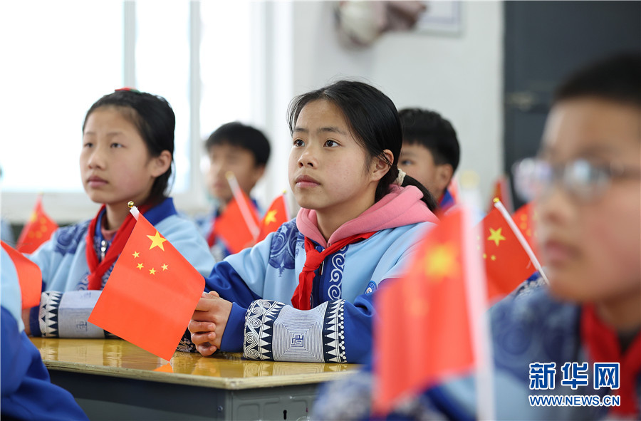 3月23日,六年級小學生在貴州省黔東南苗族侗族自治州丹寨縣揚武鎮民族小學教室裏觀看“天宮課堂”電視直播。新華網發(黃曉海 攝)