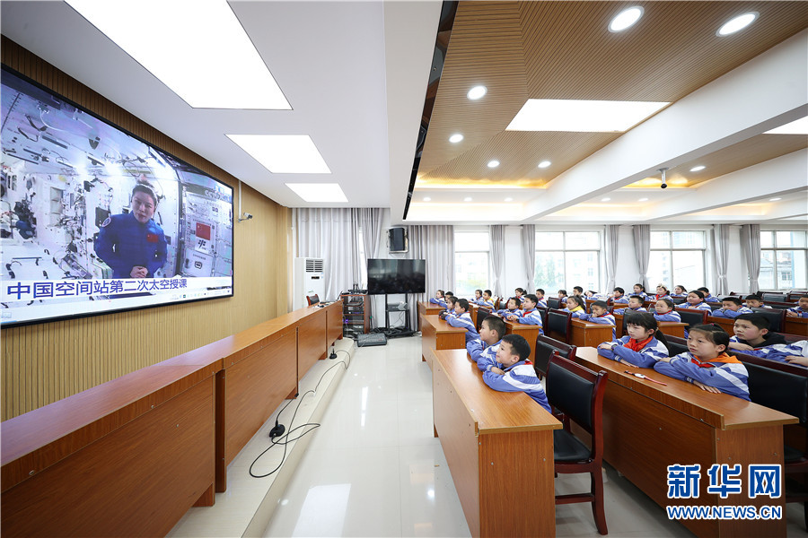 3月23日,三年級小學生在貴州省黔東南苗族侗族自治州丹寨縣城關第一小學觀看“天宮課堂”電視直播。新華網發(黃曉海 攝)