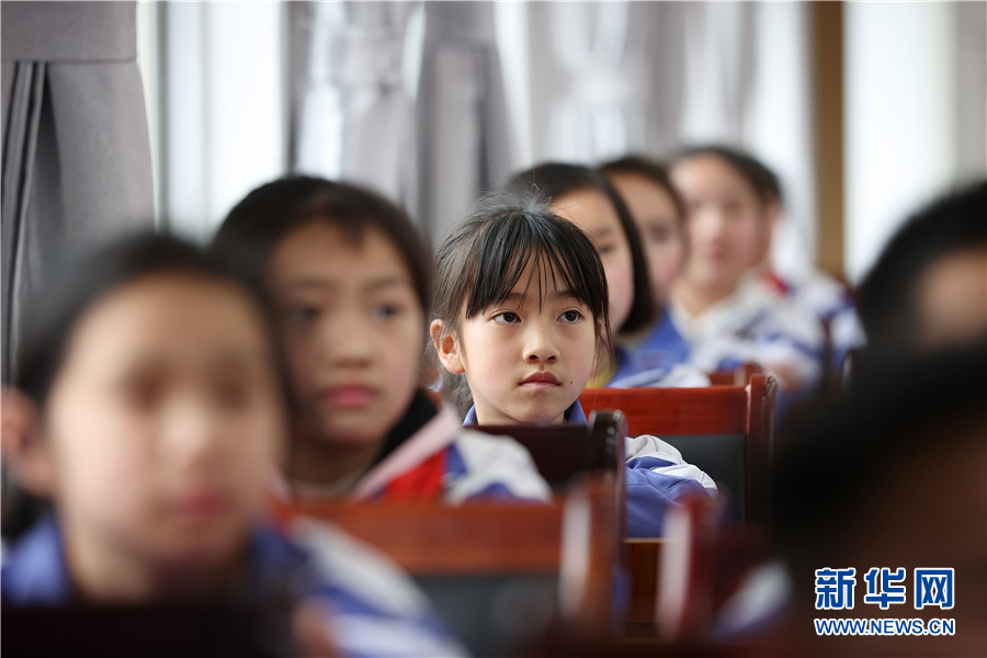 3月23日,三年級小學生在貴州省黔東南苗族侗族自治州丹寨縣城關第一小學觀看“天宮課堂”電視直播。新華網發(黃曉海 攝)