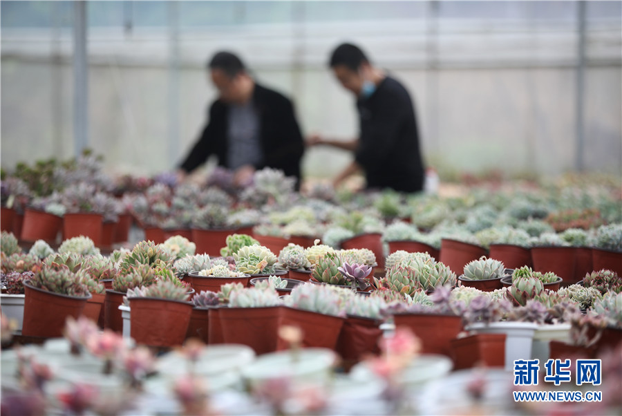3月25日,兩名顧客在貴州省畢節市黔西市林泉鎮的大棚裏挑選多肉植物。新華網 盧志佳 攝