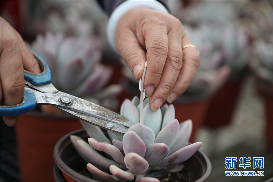3月25日,工人在貴州省畢節市黔西市林泉鎮的大棚裏修剪多肉植物。新華網 盧志佳 攝