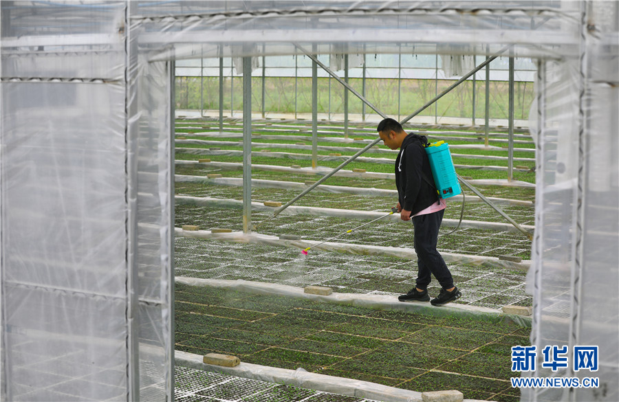 3月25日,工人在貴州省畢節市黔西市林泉鎮的育苗大棚裏給辣椒苗澆水。新華網 盧志佳 攝