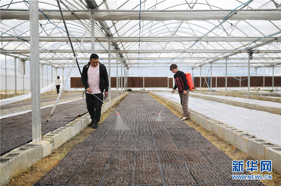 3月25日,工人在貴州省畢節市黔西市林泉鎮的育苗大棚裏給獼猴桃種子澆水。新華網 盧志佳 攝