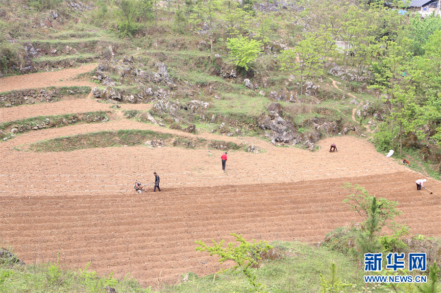 3月29日,普安縣新店鎮煙農對起好壟的煙地,開展窩施底肥、覆土。新華網 蔡連素 攝