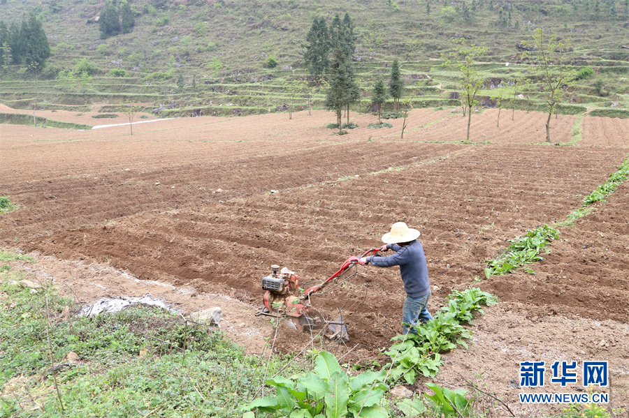 3月29日,普安縣新店鎮的煙農在煙地利用小型旋耕機進行高廂起壟,為烤煙移栽做準備。新華網 蔡連素 攝