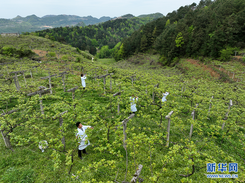 4月4日,在修文縣谷堡鎮平灘村獼猴桃種植基地,科技人員施放螳螂和小花蝽。新華網發(宋朝暉攝)