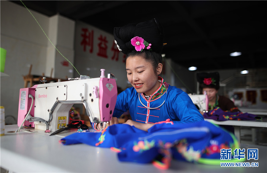 4月10日,苗族婦女在貴州省丹寨縣金泉街道易地扶貧搬遷安置點非遺手工坊縫製苗族傳統服飾。