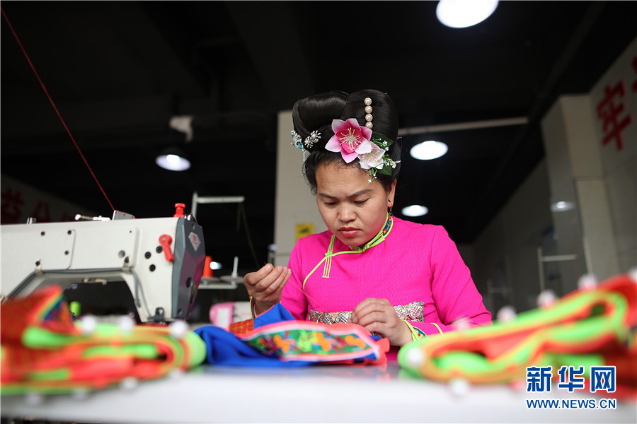 4月10日,苗族婦女在貴州省丹寨縣金泉街道易地扶貧搬遷安置點非遺手工坊繡制苗族傳統服裝飾品。新華網發(黃曉海 攝)