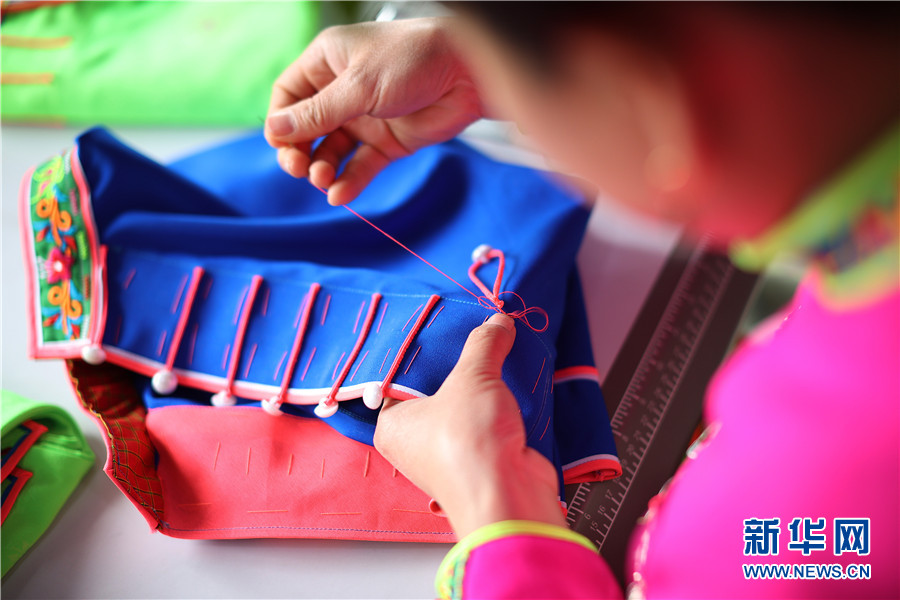 4月10日,苗族婦女在貴州省丹寨縣金泉街道易地扶貧搬遷安置點非遺手工坊縫製傳統苗族服飾。新華網發(黃曉海 攝)