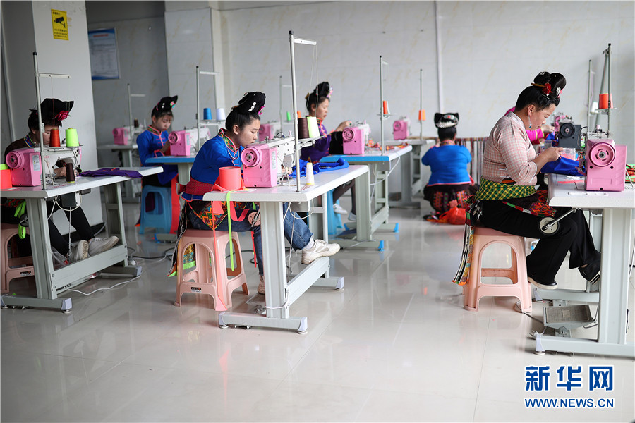4月10日,苗族婦女在貴州省丹寨縣金泉街道易地扶貧搬遷安置點非遺手工坊縫製苗族傳統服飾。新華網發(黃曉海 攝)