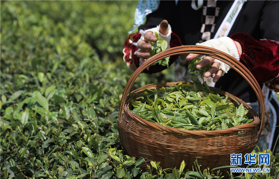 4月20日,茶農在貴陽清鎮市的中華茶博園內採茶。