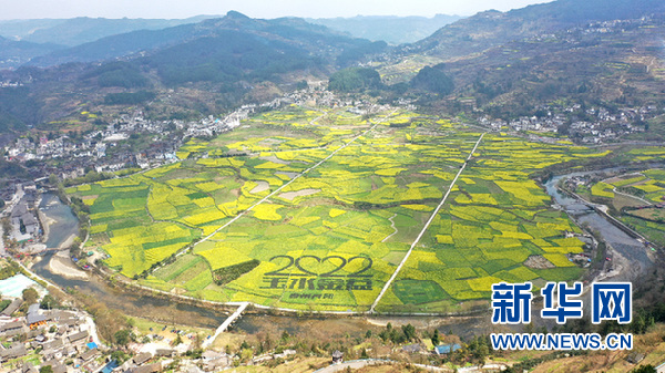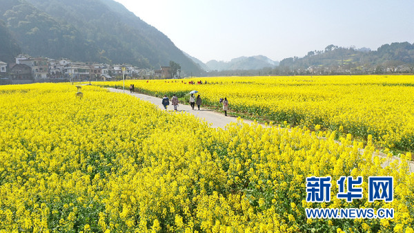 早春時節,游客在平塘縣平舟鎮京舟村的油菜花田游玩。新華網 周遠鋼 攝