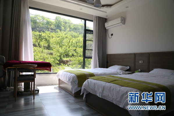 大方縣貓場鎮五丫村村民彭磊家的民宿,窗外的山坡上種滿了櫻桃樹。新華網 周遠鋼 攝