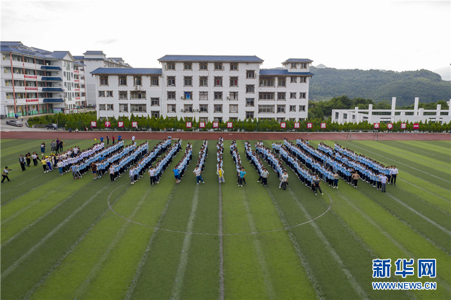 5月28日,貴州省從江縣第二民族高級中學的高三學生在參加舞蹈活動(無人機照片)。新華網發(吳德軍 攝)