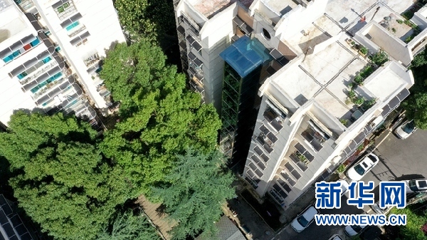 萬江社區萬江小區已裝好的一部電梯的單元樓(6月28日攝,無人機照片)。新華網 周遠鋼攝