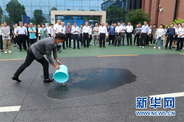 工作人員將一桶水潑到透水路面上,水被快速吸收。新華網 周遠鋼 攝