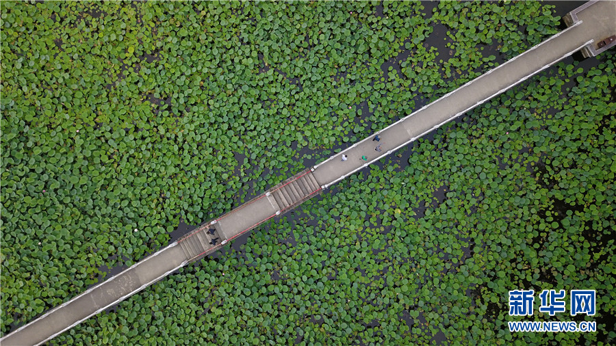 7月10日清晨,游客在招堤荷塘的廊橋上。(無人機照片)。新華網 黃勇 攝