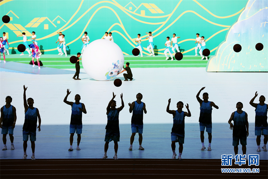 8月8日,貴州省第十一屆運動會開幕式上的籃球運動展示。新華網 盧志佳 攝