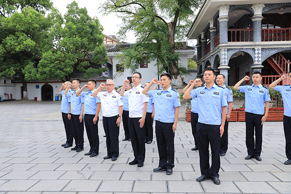 在全國公安系統二級英雄模範袁紅同志帶領下,全體黨員面向黨旗,莊嚴肅立,右手握拳齊肩舉起,鏗鏘有力地重溫入黨誓詞,以飽滿的熱情和昂揚的姿態,表達着為黨的公安事業奮鬥終生的堅強決心和堅定信念。