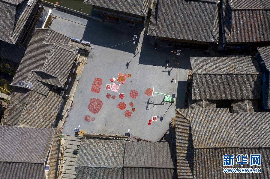 8月28日,在貴州省從江縣往洞鎮增衝侗寨,村民在晾曬辣椒(無人機照片)。