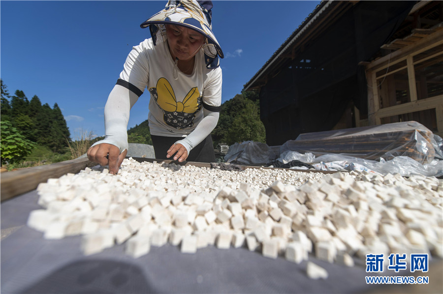 8月28日,在貴州省從江縣往洞鎮增盈侗寨,村民在晾曬中藥材土茯苓。新華網發(吳德軍 攝)