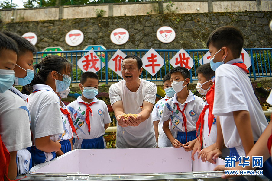 9月19日,貴州省黔東南苗族侗族自治州凱里市第四小學科學老師向同學們展示收穫的稻穀。新華網發(蔡興文 攝)