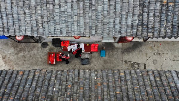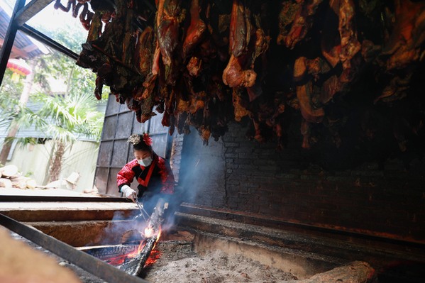 1月2日,貴州省劍河縣岑松鎮溫泉村,苗族群眾在查看臘肉熏制情況。