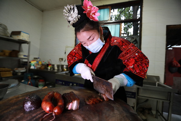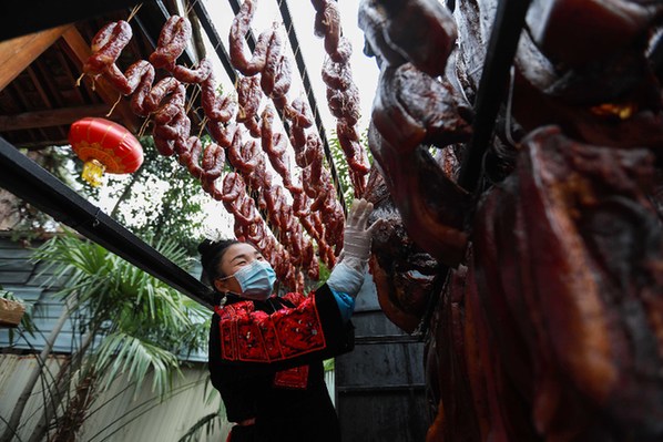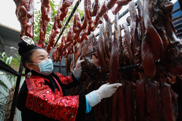1月2日,貴州省劍河縣岑松鎮溫泉村,苗族群眾在切成品的臘肉。