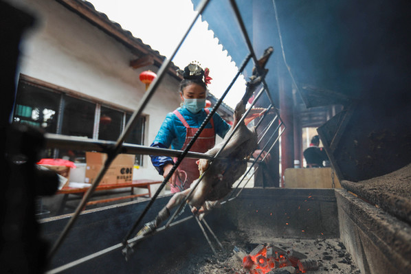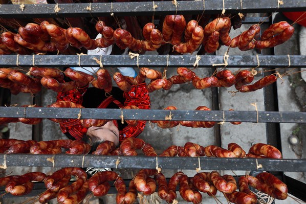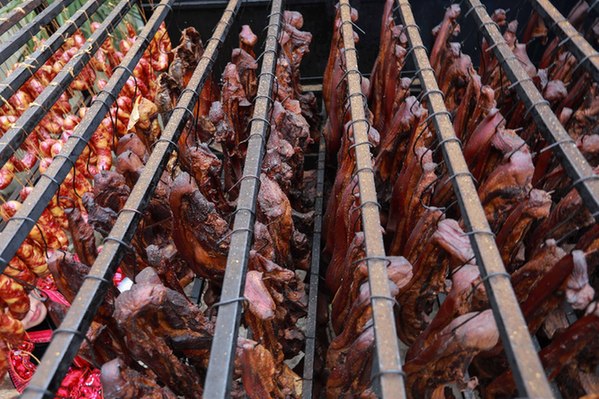 春節臨近,在貴州省黔東南苗族侗族自治州劍河縣岑松鎮溫泉村,苗族同胞正忙着腌制烘烤臘肉、香腸、板鴨,線上線下為顧客提供味道純正、香味濃郁的臘味年貨,供應市場。(萬文傑 楊家孟 吳昌連 攝)