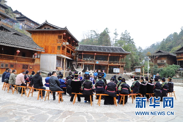 苗語宣講隊給群眾宣講黨的二十大精神。新華網發(張強攝)