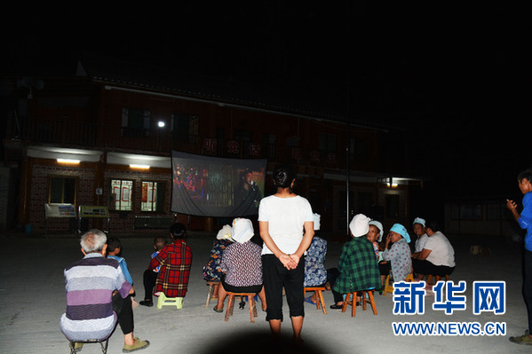 勞作一天的革一鎮大塘村群眾圍觀影片。新華網發(張強攝)