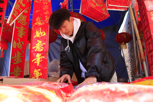 1月12日,阿市鄉集市上商鋪老闆正在整理春聯。周照人 攝