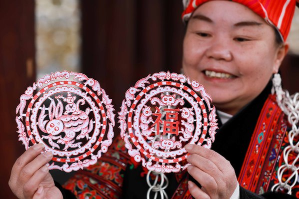 1月17日,國家級非物質文化遺産苗族剪紙傳承人姜文英在劍河縣華潤希望小鎮展示剛剪的“福兔”窗花。(吳昌連 攝)