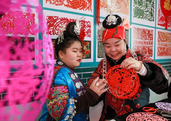 1月17日,劍河縣華潤希望小鎮剪窗花。國家級非物質文化遺産苗族剪紙傳承人姜文英(右)在教剪紙愛好者剪窗花。(吳昌連 攝)