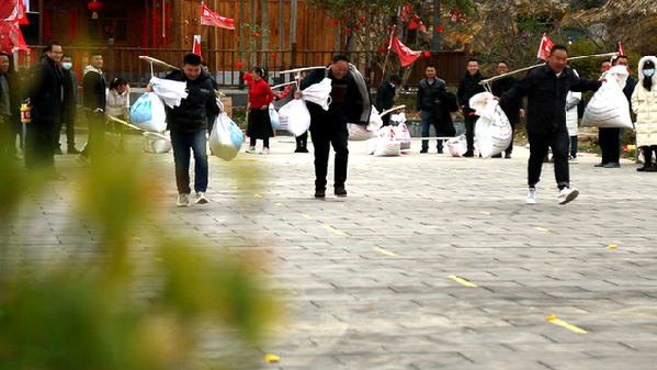在挑糧食比賽現場,隨着主持人哨聲響起,鄉親們挑起稻穀向終點衝去,為新一年春耕播種討來新希望好彩頭。