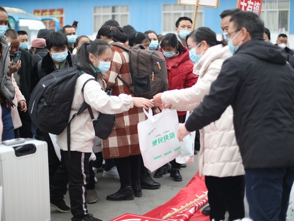 岑鞏縣政府工作人員將“新春大禮包”發放給乘坐免費返崗直通車集中返崗的群眾。(沈婷 攝)