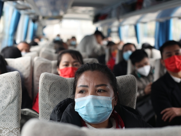 岑鞏縣免費返崗直通搭載外出務工群眾集中返崗。(沈婷 攝)